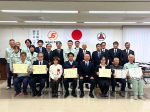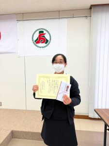 式典の中で、今年度「第一種衛生管理者」の資格を取得した当社社員の表彰が行われ、賞状及び副賞が授与されました。